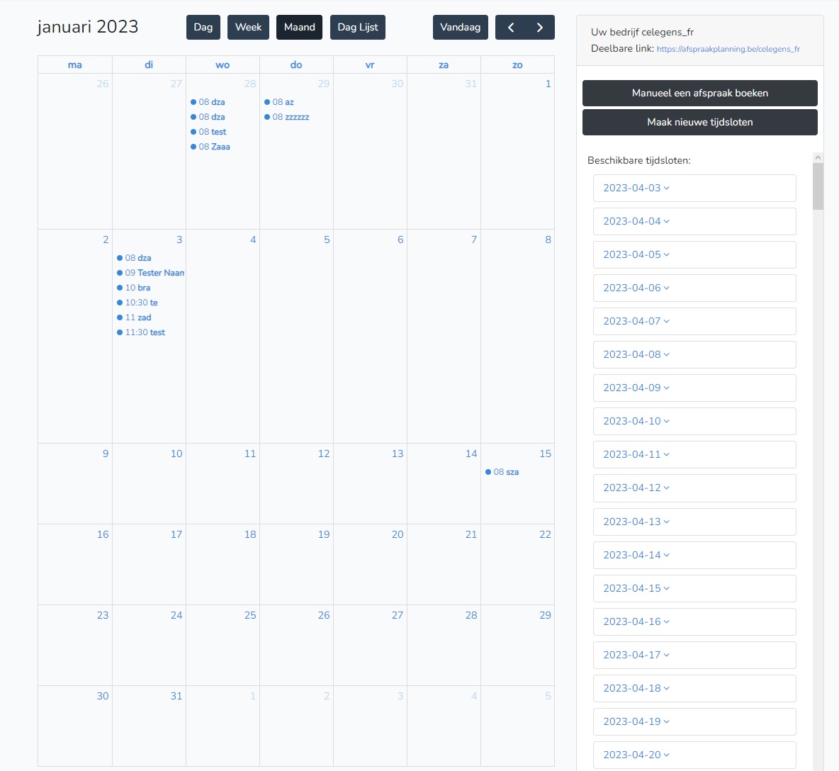Natuurlijk is het van groot belang dat u de geplande afspraken kan opvolgen en beheren, dit is mogelijk op onze admin pagina, waar u zowel de ingeplande afspraken kan bekijken alsook nieuwe tijdsloten kunt registreren & een afspraak manueel kan inplannen. Alles gecentraliseerd in 1 plek!